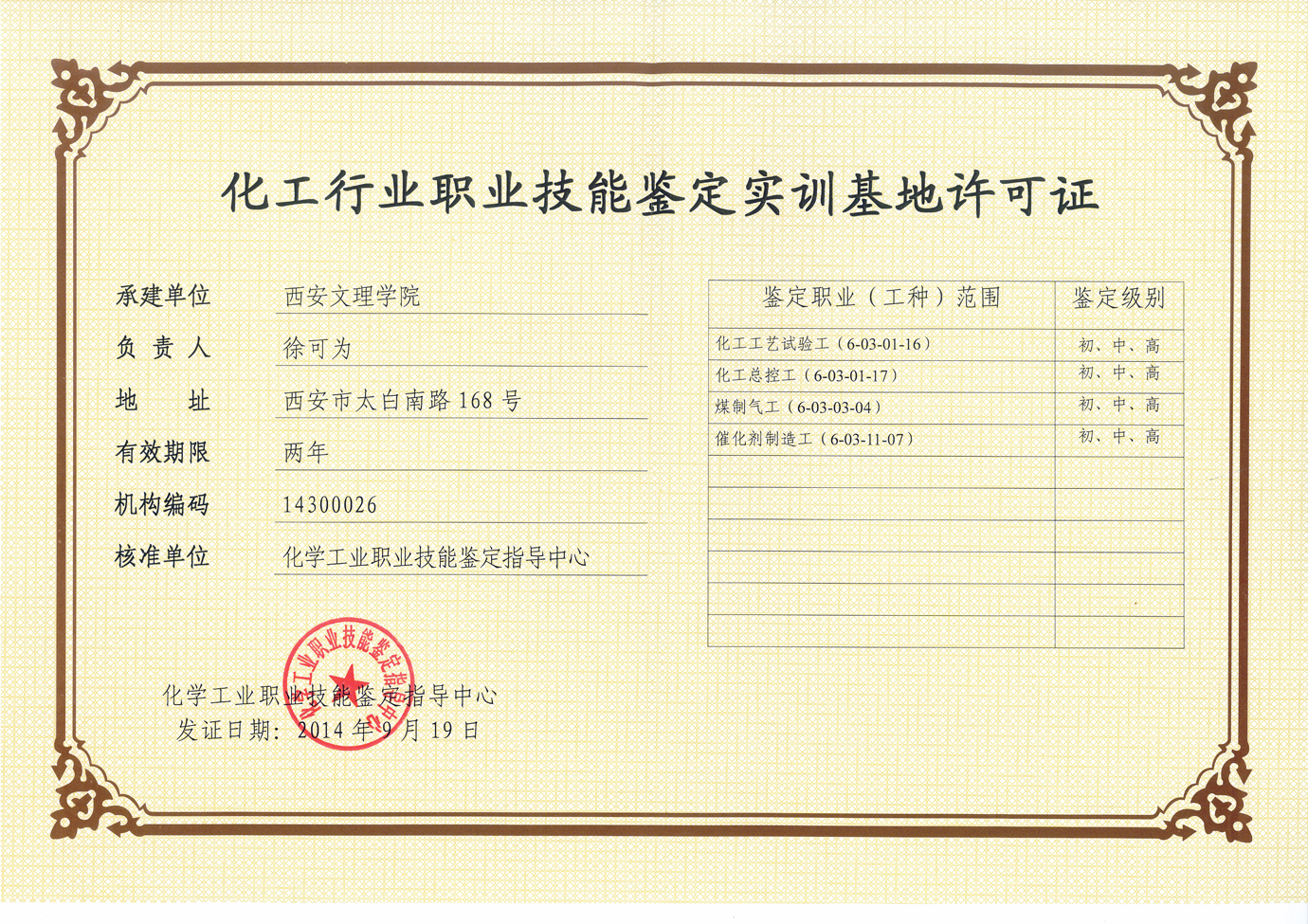 化工职业技能鉴定许可证