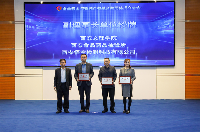 3月19日上午,食品安全与检测产教融合共同体暨产业公司在公司成立。西安市市场监督管理局党委书记、局长郝生旺与公司党委书记王育选为食品安全与检测产教融合共同体揭牌。董事长陈刚为共同体理事长及副理事长单位授牌。