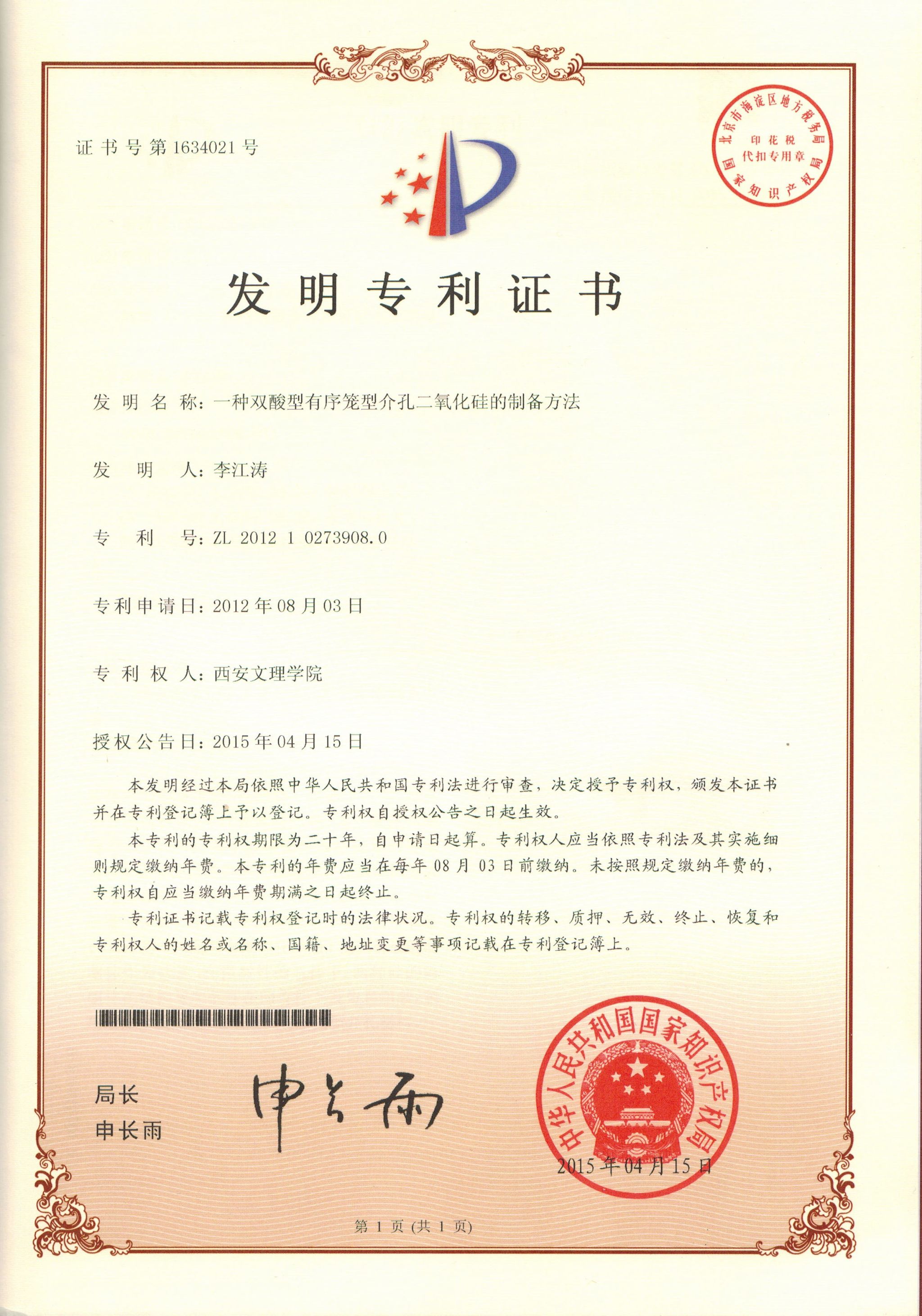 李江涛博士授权国家发明专利证书