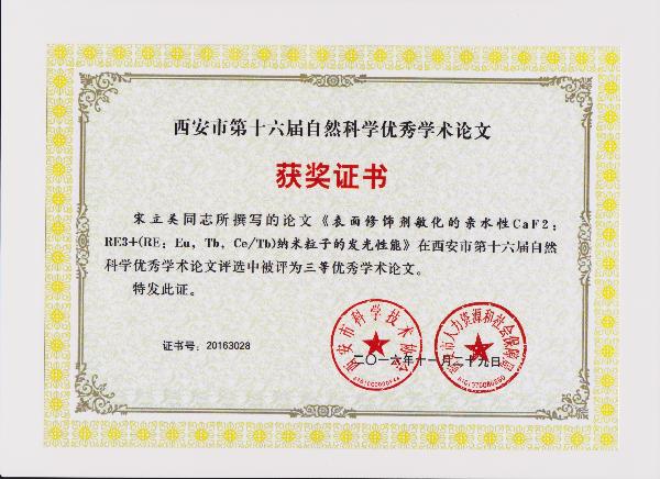 宋立美博士获2016年西安市自然科学优秀论文三等奖