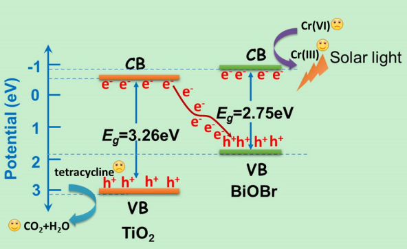 项目简介:基于实际污染水体中污染物的复杂多样性,并不只是以单一污染物形式存在的考虑,本研究拟构建一种全固态Z型BiOBrTiO2复合半导体光催化材料。与传统的异质结构不同,该Z型异质结材料在太阳光的照射下,不仅可以增加电子空穴分离效率,还可以保持较高的氧化还原能力。由于其氧化反应与还原反应活性位点的位置不同,可以高效地用于光催化氧化有机抗生素分子与光催化还原重金属离子(Cr(VI))的协同反应过程中,达到同时高效去除复杂污水体系中有机-无机污染物的目的。