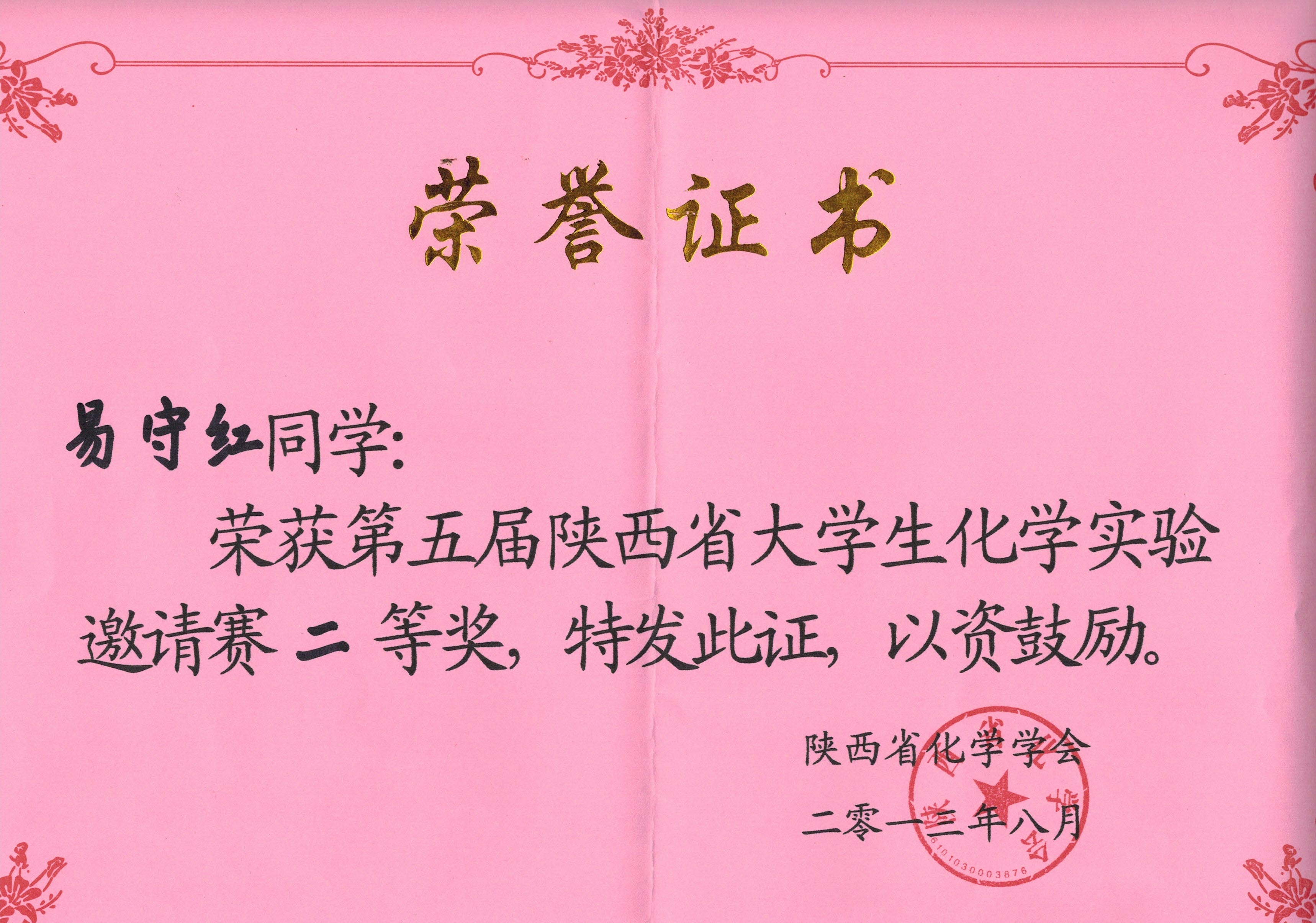 第五届陕西省老员工化学实验邀请赛二等奖