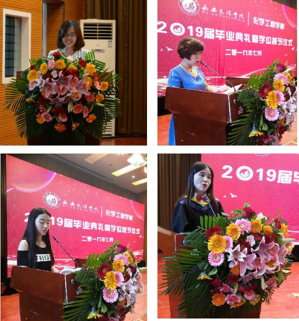 教师代表宋瑞娟分享经历,人生的各个阶段总是充满了挑战,但人生原本就是个痛并快乐的过程,希望毕业生抓住机遇,挑战明天,成就未来。员工张明远母亲代表所有家长嘱咐全体毕业生:饮水思源,永远不要忘记母校恩师;大学毕业绝不意味着学习的终止,而是向社会学习的新起点。毕业生代表谢卓堪从四年的成长历程出发,表达了对老师们的感激之情。