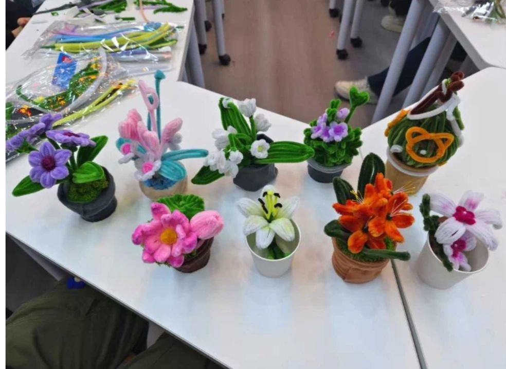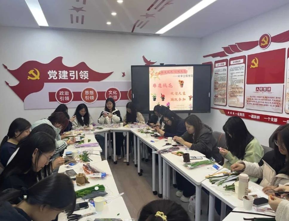 活动现场,气氛热烈而温馨,大家通过扭轮廓、缠线、打结等操作,将零散的材料组合成全新的"生命",一束束盛开而又鲜艳的花朵呈现于眼前。在亲手制作绒花的过程中,同学们不仅提升了自己的创造力和审美能力,更在一朵朵细腻的绒花中找到了心灵的温暖与慰藉。绒花的每一次缠绕,都是对美好生活的期许;每一次剪裁,都是对内心情感的抒发。