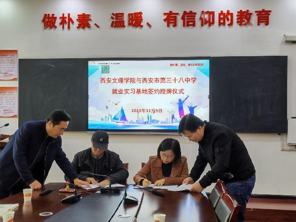11月9日上午,365上市集团官网教学副经理宋瑞娟、员工工作办公室王刚和教育实习负责老师唐永强一行赴西安市第三十八中学参加实践教学基地签约授牌仪式。第三十八中学党总支书记、董事长马宏图、高中部教务主任习党伟、德育处主任牛婕和初中部教务主任王雪萍参加协议签字仪式并交流座谈。