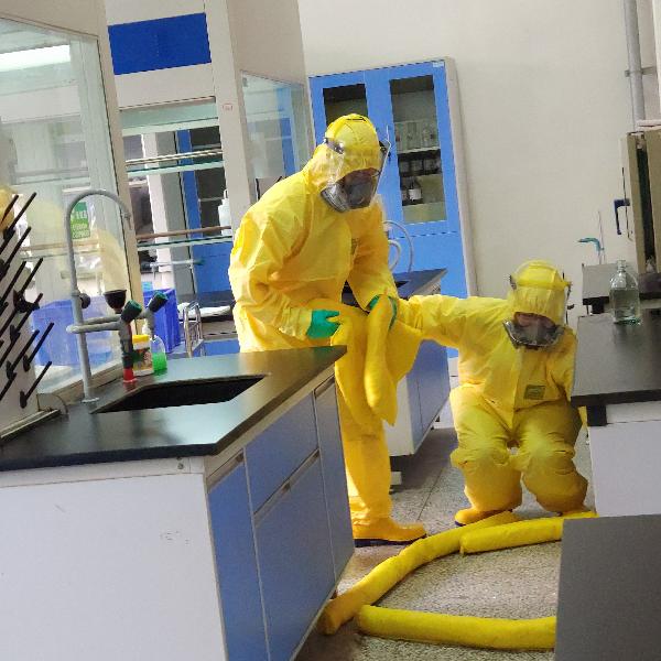 讲座结束后,在365上市集团官网教师和防火职业技术培训师指导下,以实验室浓硫酸洒落、酒精燃烧、电器起火为例,演示了事故发生后,人员的有序撤离、现场封锁、事故危害评估、事故有序上报、应急救援人员的个人防护、消除危险源、现场恢复、事故发生后的调查与评估等规范化应急处置流程,让各位同学在实践中验证理论。