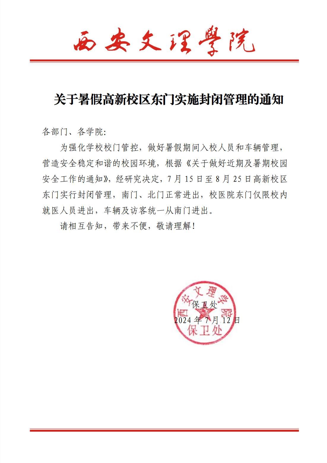 关于暑期高新校区东门实施封闭管理的通知