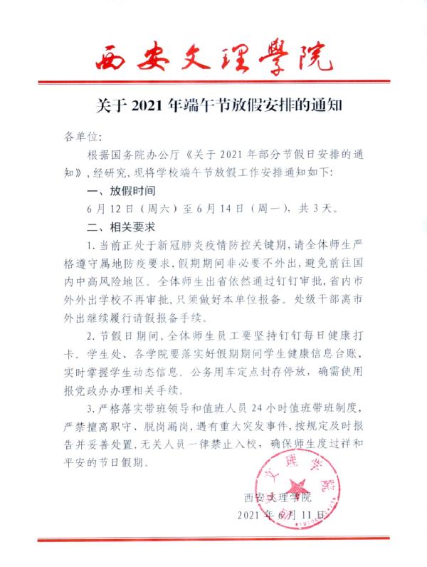 关于2021年端午节放假安排的通知